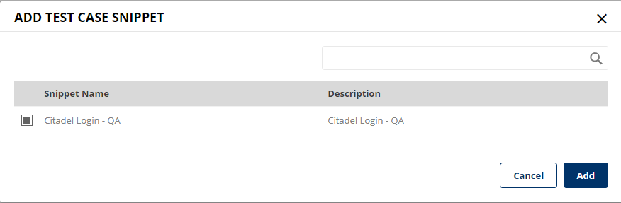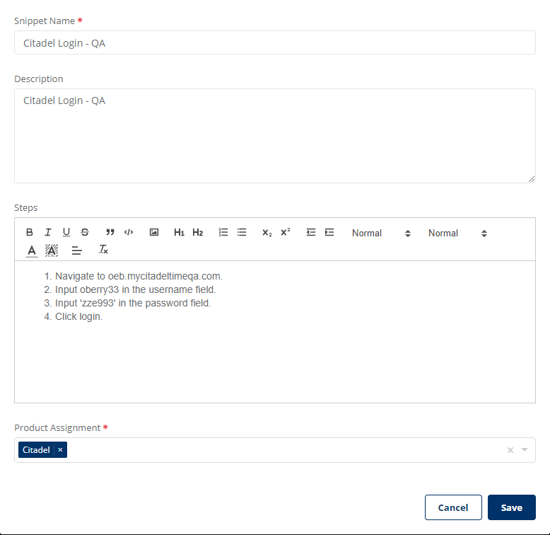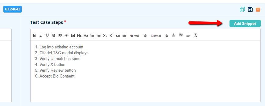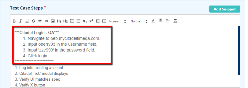 Allows admins to create reusable snippets that can be setup once and used across many test suites and test cases. For example, often times the first few steps of a test require a user to login to a product and/or environment. Rather than specifying those steps in every test case developed a single test case snippet may be created and assigned to all test cases where applicable. Additionally, if those steps change the snippet may be changed and those changes will automatically propagate to all assigned test cases.